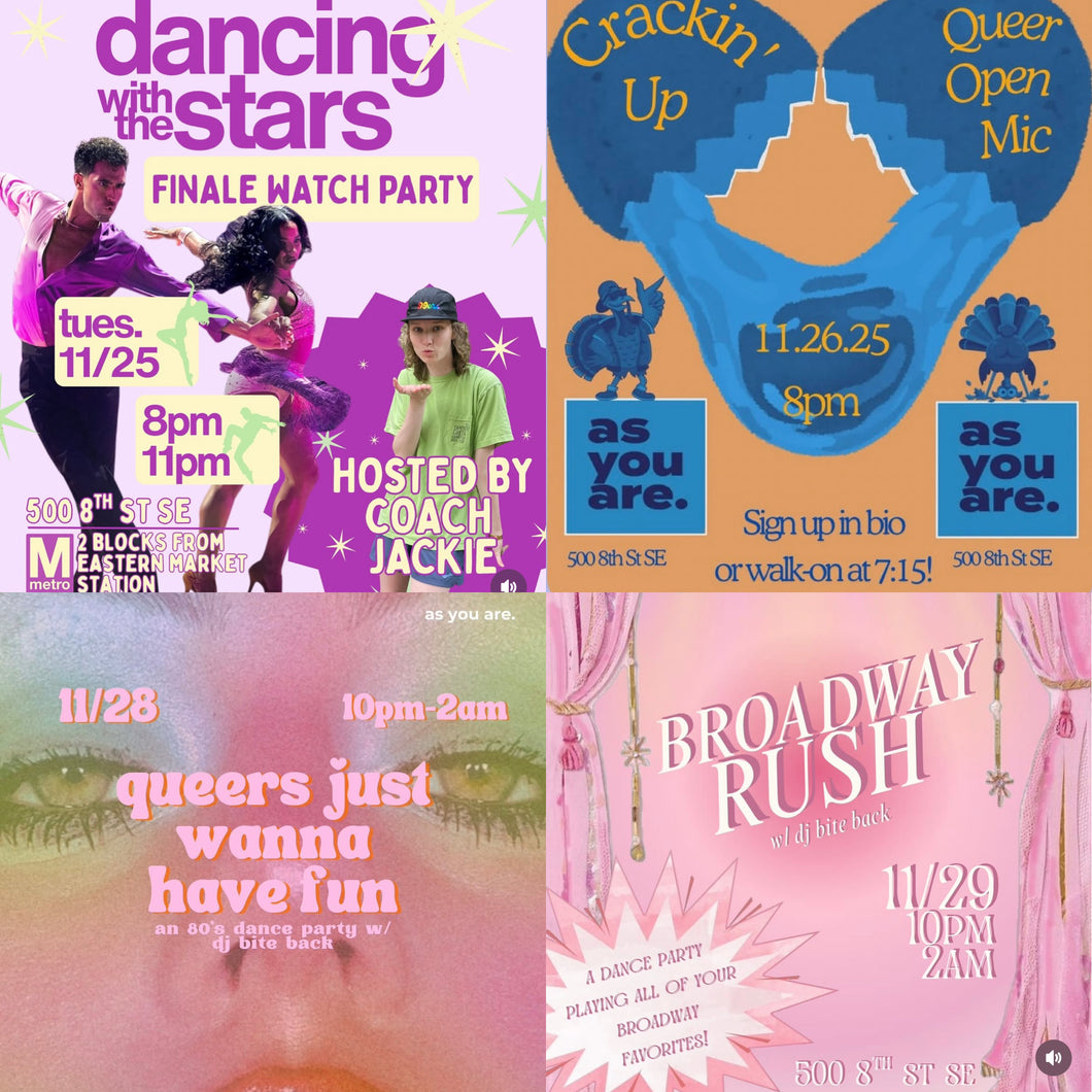 Checkout our events page and IG @asyouaredc to see the upcoming events!